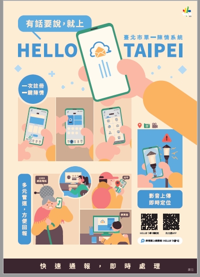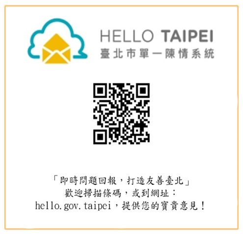 親愛的臺北市民們,如您有市政相關意見,歡迎至臺北市單一陳情系統HELLO TAIPEI APP,或下載台北通APP反應寶貴訊息