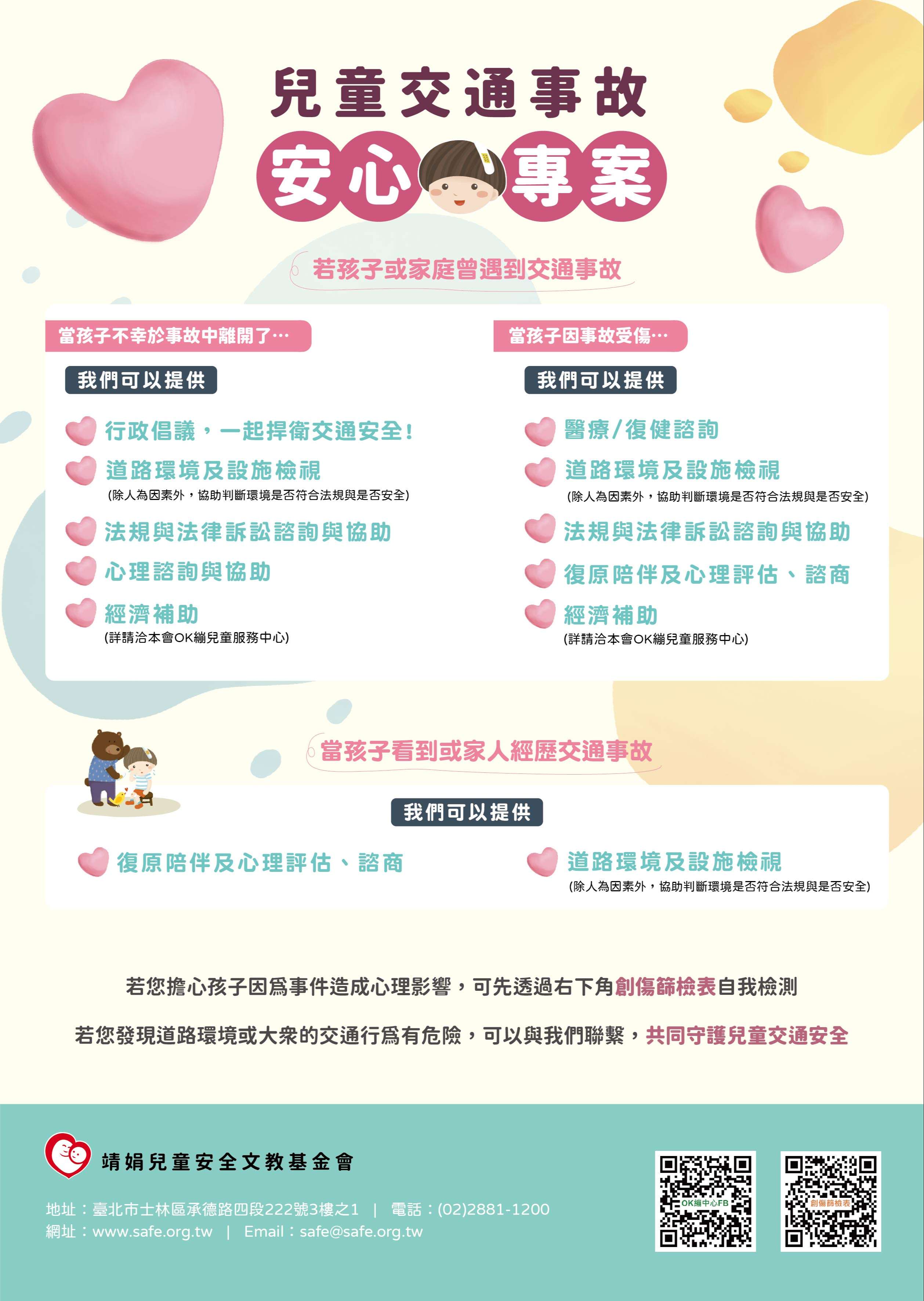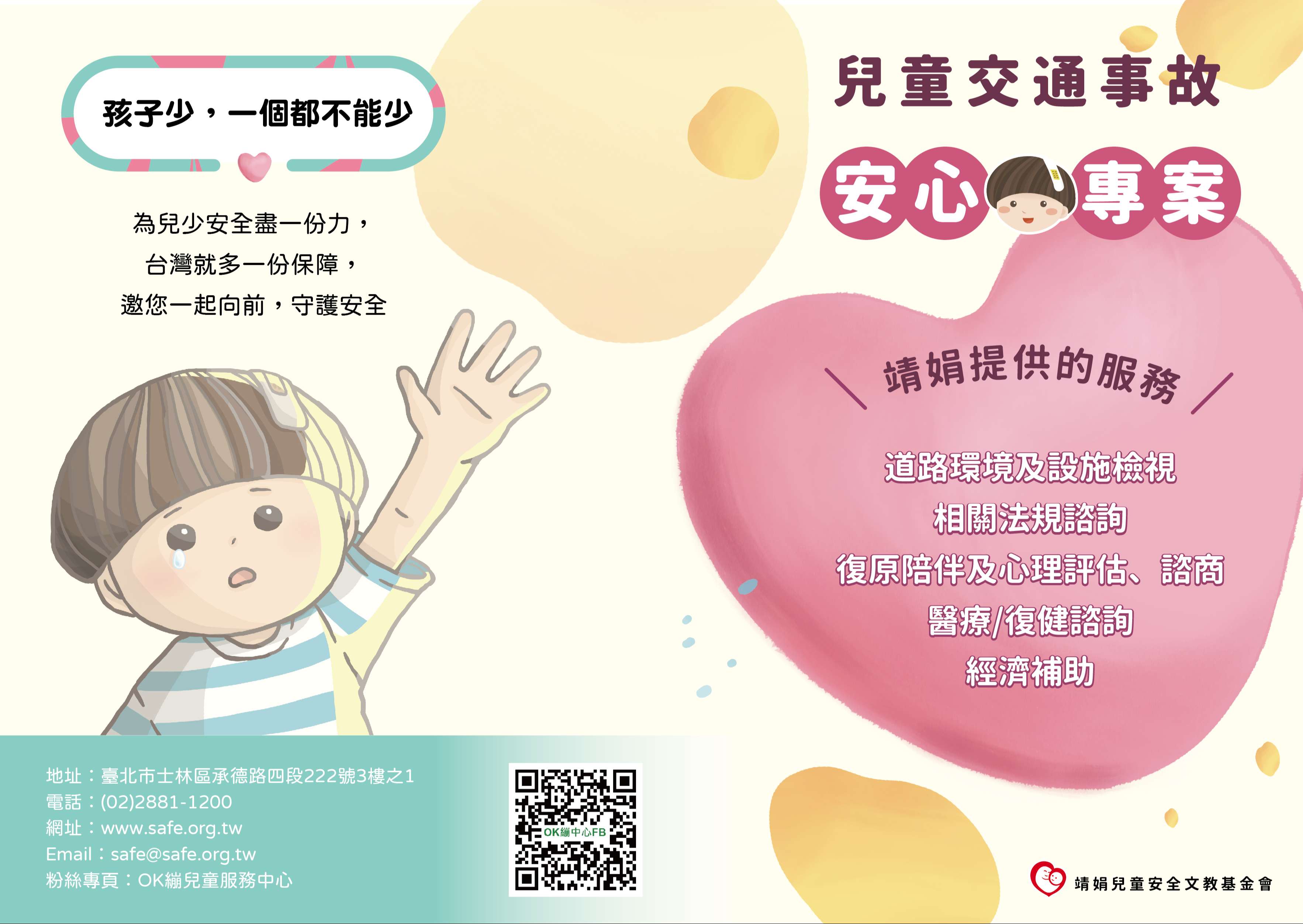 為協助兒少及其家庭面對交通事故後之問題及穩定就學,靖娟基金會自110年開辦「兒少交通事故安心專案」,以經歷交通事故之兒少為核心,提供法律、醫療、心理、環境檢視與行政倡議之服務。