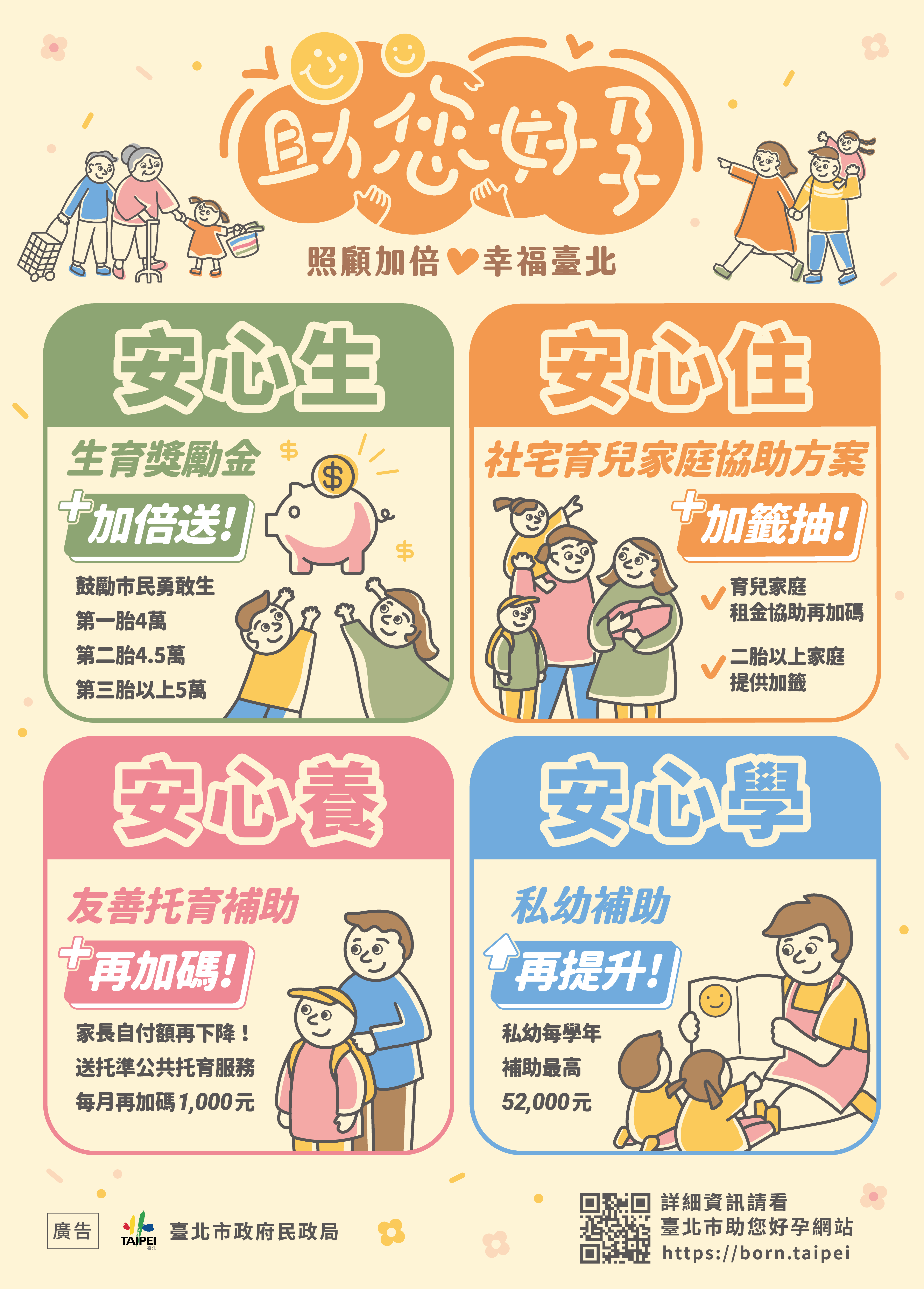 1.臺北市助您好孕專案推出生育獎勵金加倍送、社宅育兒家庭協助方案、友善托育補助再加碼、私幼補助再提升等措施,更多友善育兒政策可至助您好孕網站查詢:https://born.taipei/