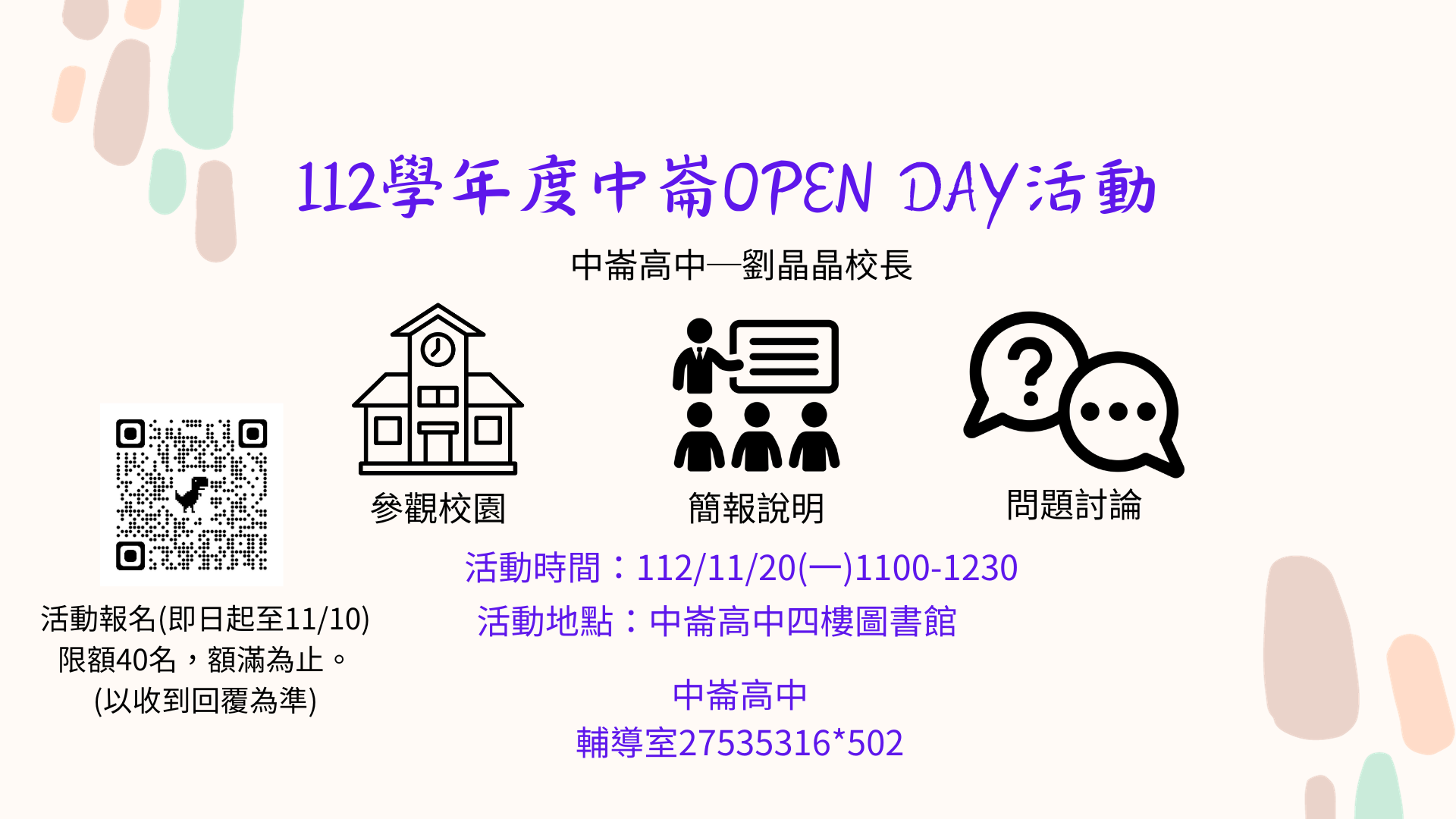 學校校於112年11月20日(一)辦理「中崙OPEN DAY活動」,誠摯邀請貴校家長參加,並歡迎孩子共同參與。