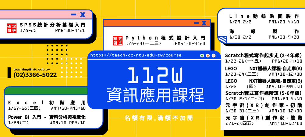 二、該中心112W和1122資訊應用課程共開設五大系列課程:程式設計、統計分析、影像處理、文書處理、兒童班系列,活動海報與課程一覽表如附件。