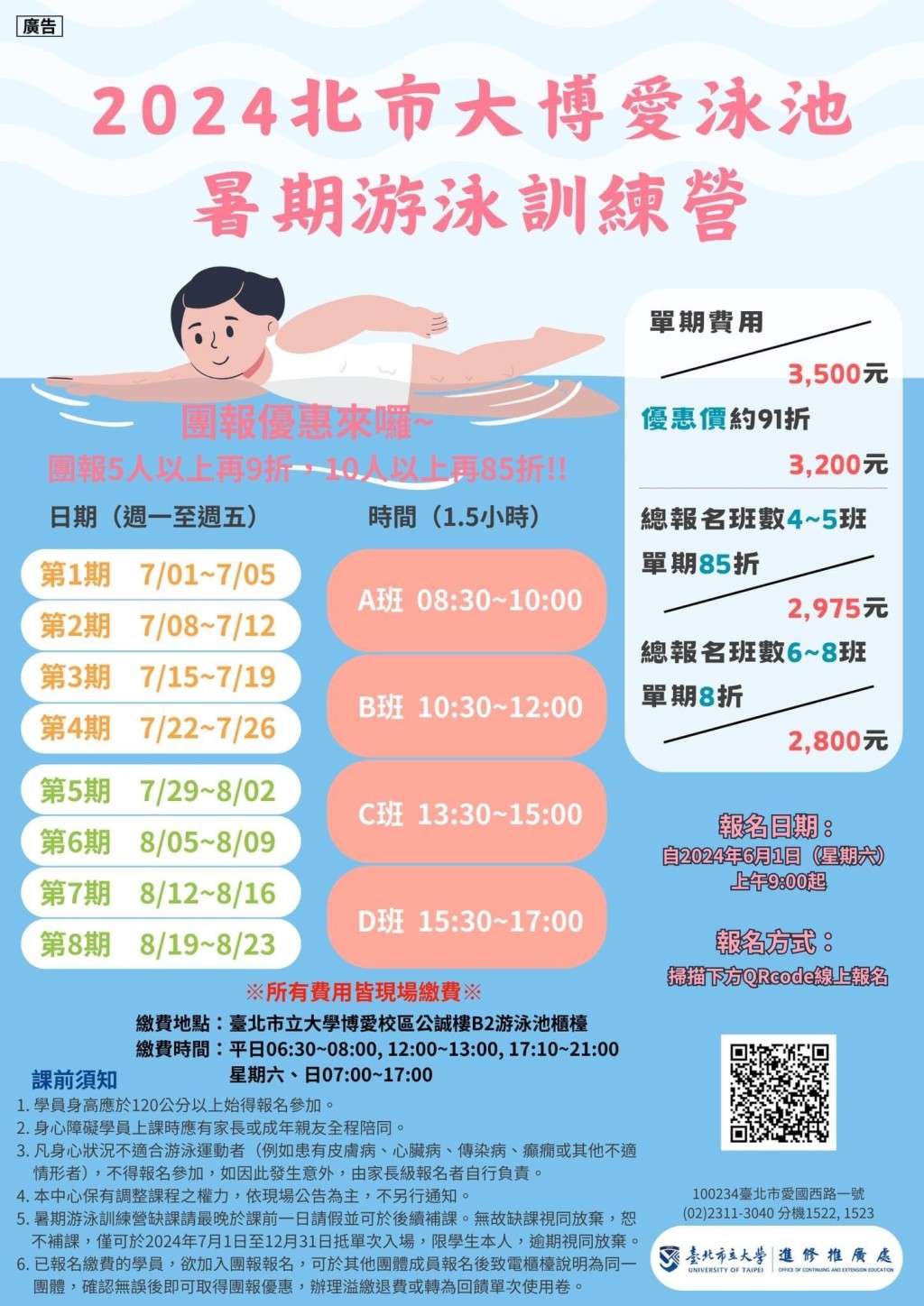 二、本校博愛校區泳池環境優良、設備完善、師資專業,請惠予轉知校內同學及家長,歡迎前來報名參加泳訓班。線上報名頁面連結:https://cee.utaipei.edu.tw/course /164。