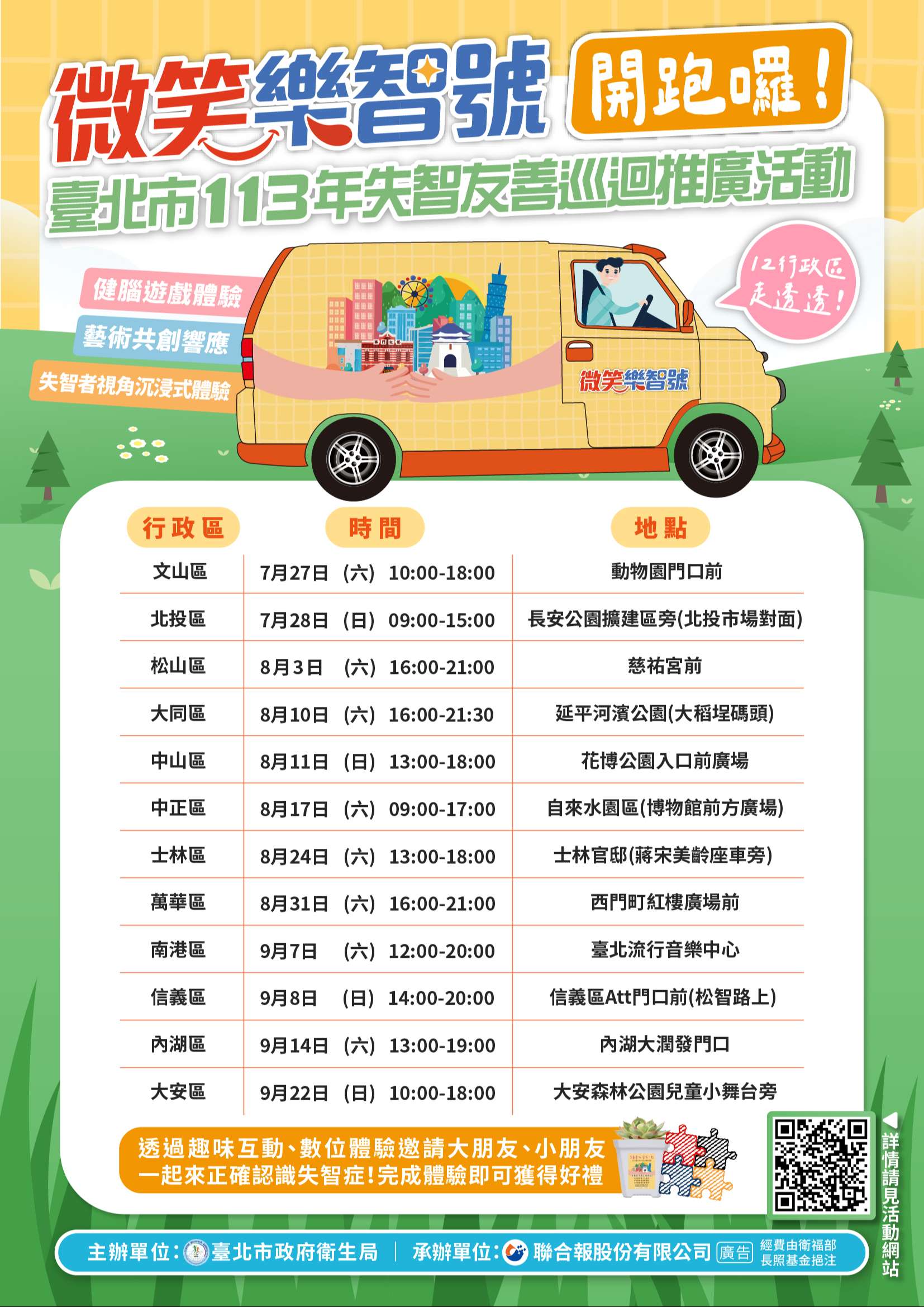 一、為增加民眾對失智症的認識,本局113年結合「微笑樂智 號」胖卡,規劃「健腦活動」、「沉浸式體驗展」、「藝 術共創響應」等多元內容,巡迴本市十二行政區,藉由趣 味互動吸引民眾參與,並認識及預防延緩失智症,成為友 善社區的一份子。