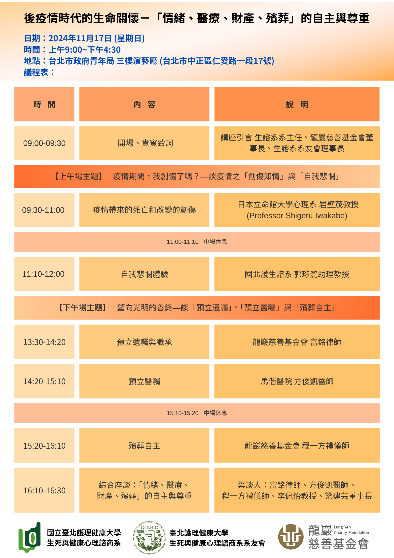 二、講座主題:「後疫情時代的生命關懷—『情緒、醫療、財 產、殯葬』的自主與尊重」。 (一)上午場講座:主題:疫情期間,我創傷了嗎?—談疫情 之「創傷知情」與「自我悲憫」。 (二)下午場講座:主題:望向光明的善終─談「預立遺 囑」、「預立醫囑」與「殯葬自主」。 (三)活動費用:免費參加。