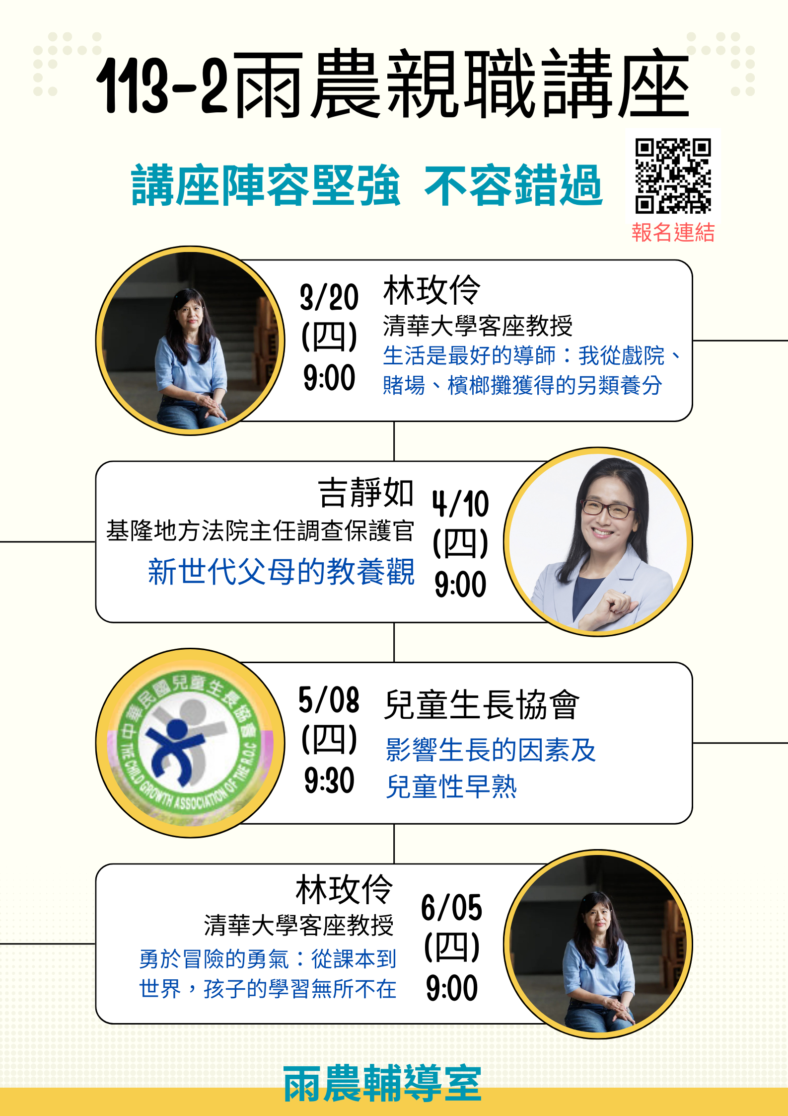一、本校3至6月共計辦理四場親職講座課程,結合愛的存款簿 學習集點活動給予時數,地點在本校活動中心一樓視聽教 室。講座課程內容如下: (一)3/20(四)9:00-11:30 林玫伶清大客座教授,講題:「生 活是最好的導師:我從戲院、賭場、檳榔攤獲得的另類 養分」。 (二)4/10(四)9:00-11:30 吉靜如主任調查保護官,講題: 「新世代父母的教養觀」。 (三)5/8(四)9:30-11:30 兒童生長協會,講題:「影響生長的 因素及兒童性早熟」。 (四)6/5(四)9:00-11:30 林玫伶清大客座教授講題:「勇於冒 險的勇氣:從課本到世界,孩子的學習無所不在」。