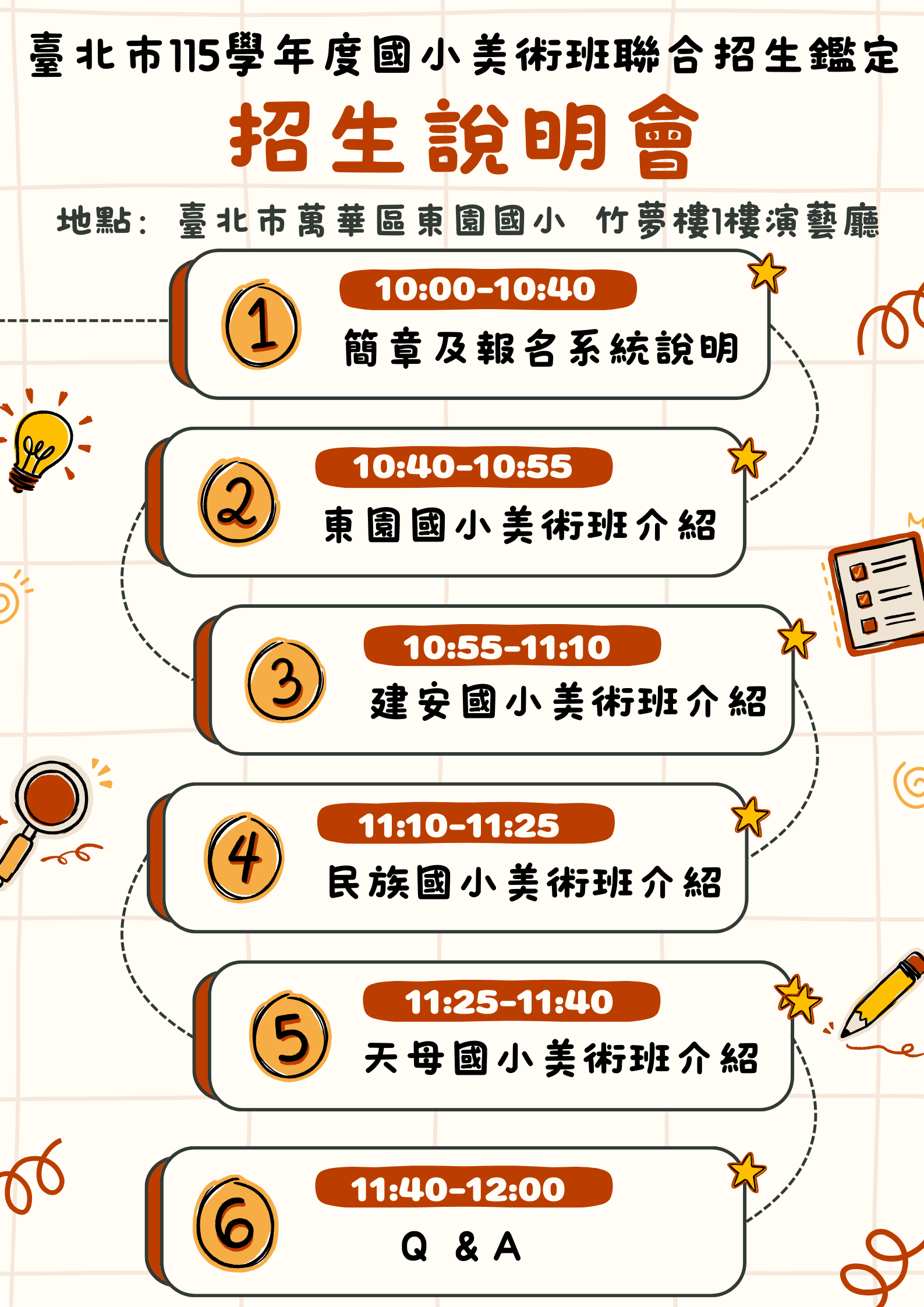 二、招生鑑定說明會資訊如下: (一)時間:115年3月4日(星期三)上午10: 00。 (二)地點:東園國小竹夢樓1樓演藝廳。(臺北市萬華區東園 街195號) (三)活動內容:簡介本次國小藝術才能美術班招生鑑定考試 期程及術科測驗相關內容,並說明各校美術班教學環境 與學校特色。 (四)相關招生訊息,可致電本校特教組張組長(02)2303- 4803分機1603。